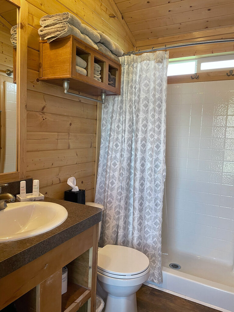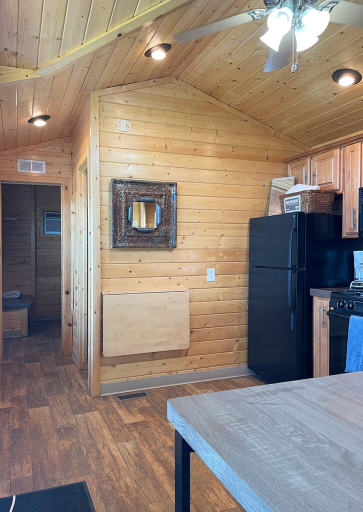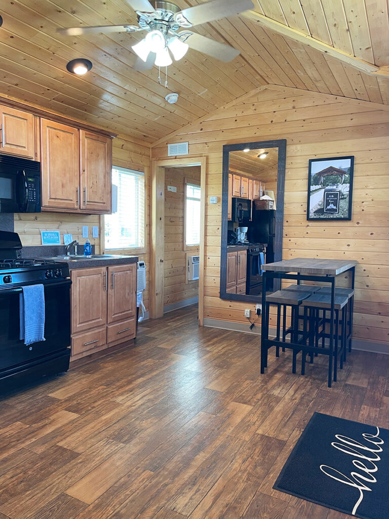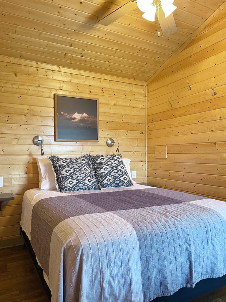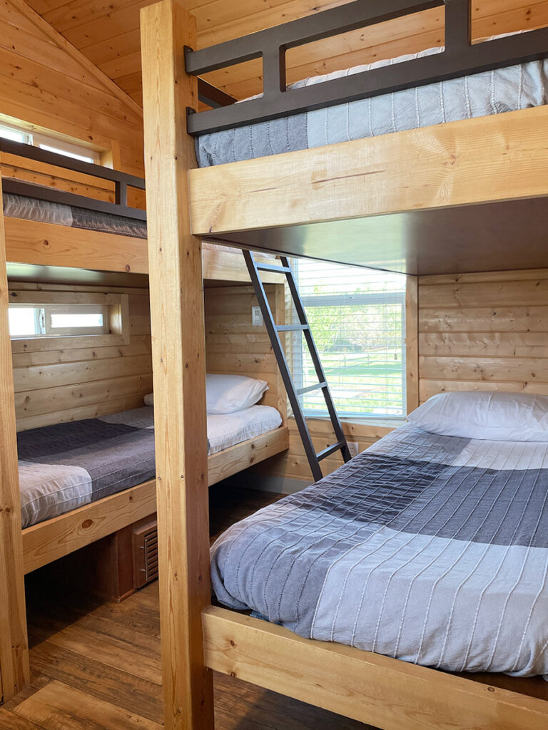 The wedding package for lodging on both Friday and Saturday nights (Weekend Package) includes the cabin. Featuring 2 bedrooms—a honeymoon room with one queen bed and a guest room with 2 sets of twin bunks—along with a bathroom, kitchen, and living room, this cabin offers comfortable accommodations. Suitable for up to 6 people, please note that pets and smoking are not permitted in the cabin.